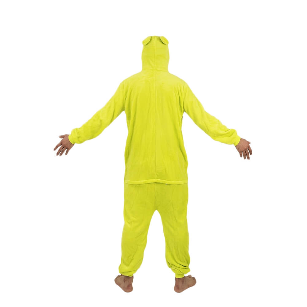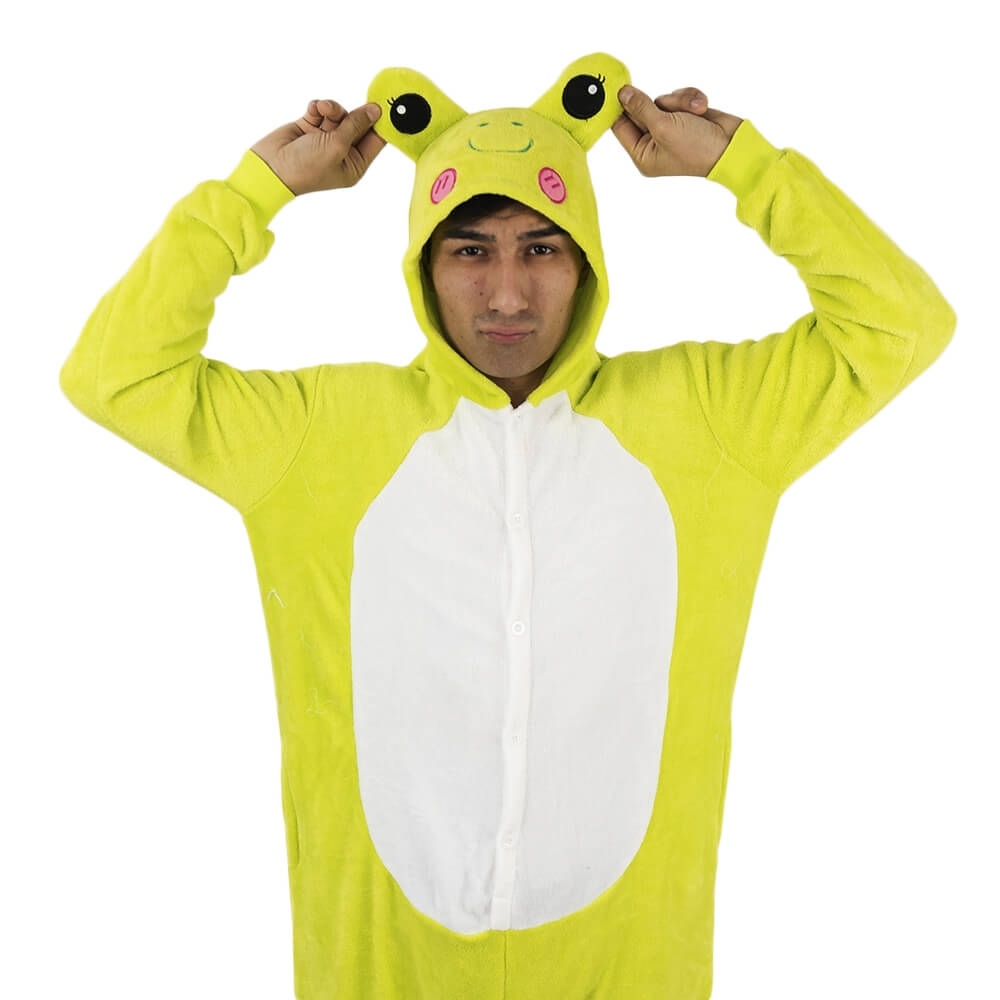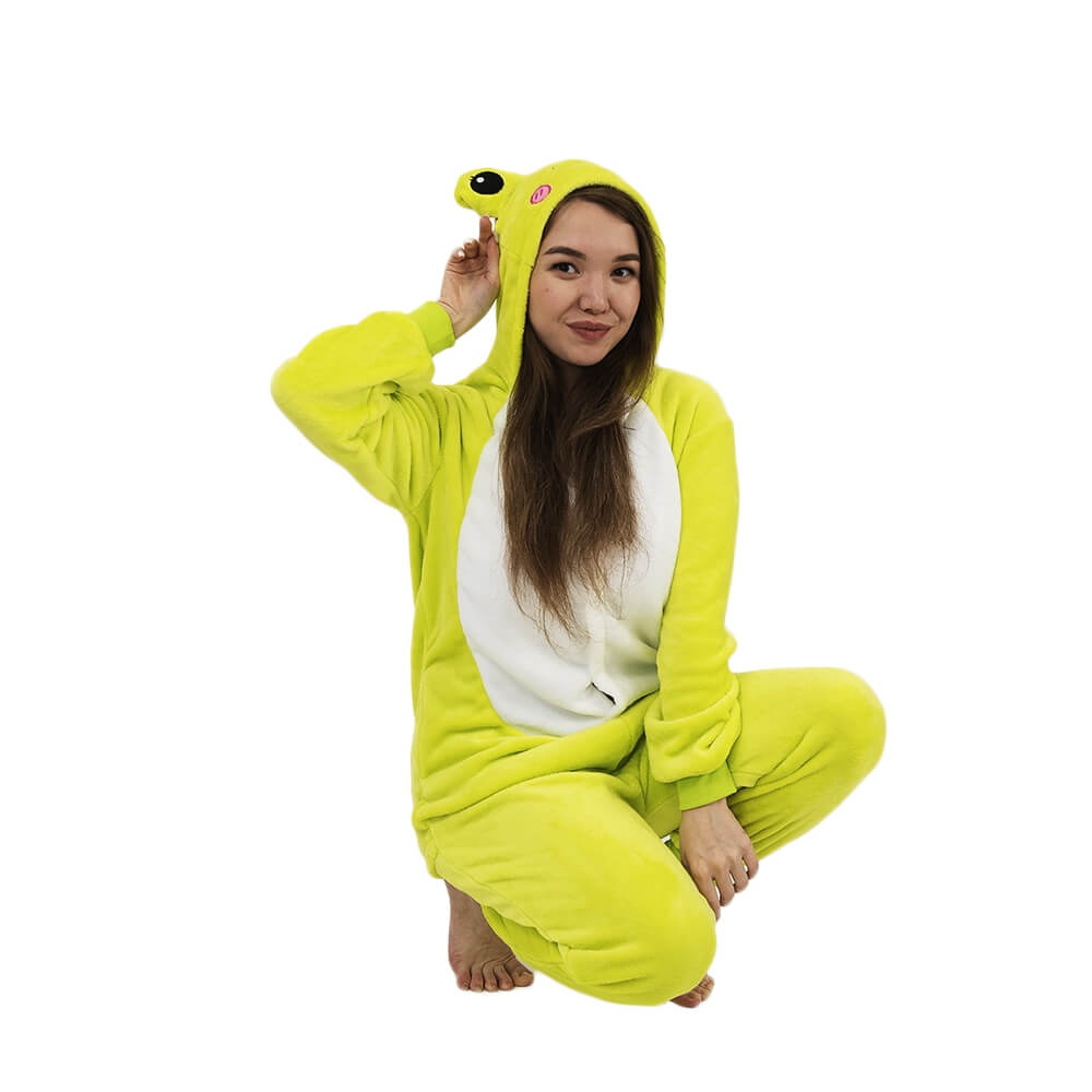 У этой модели кигуруми яркий дизайн, который подойдет и мужчине, и женщине. Модель сшита из мягкой и приятной на ощупь ткани, за которой легко ухаживать. Она выдерживает машинную стирку, не мнется, имеет небольшую эластичность. Крой продуман до мелочей: широкие штанины и рукава, застежка не только впереди, но и сзади, боковые карманы. На капюшоне изображена мордочка лягушонка.