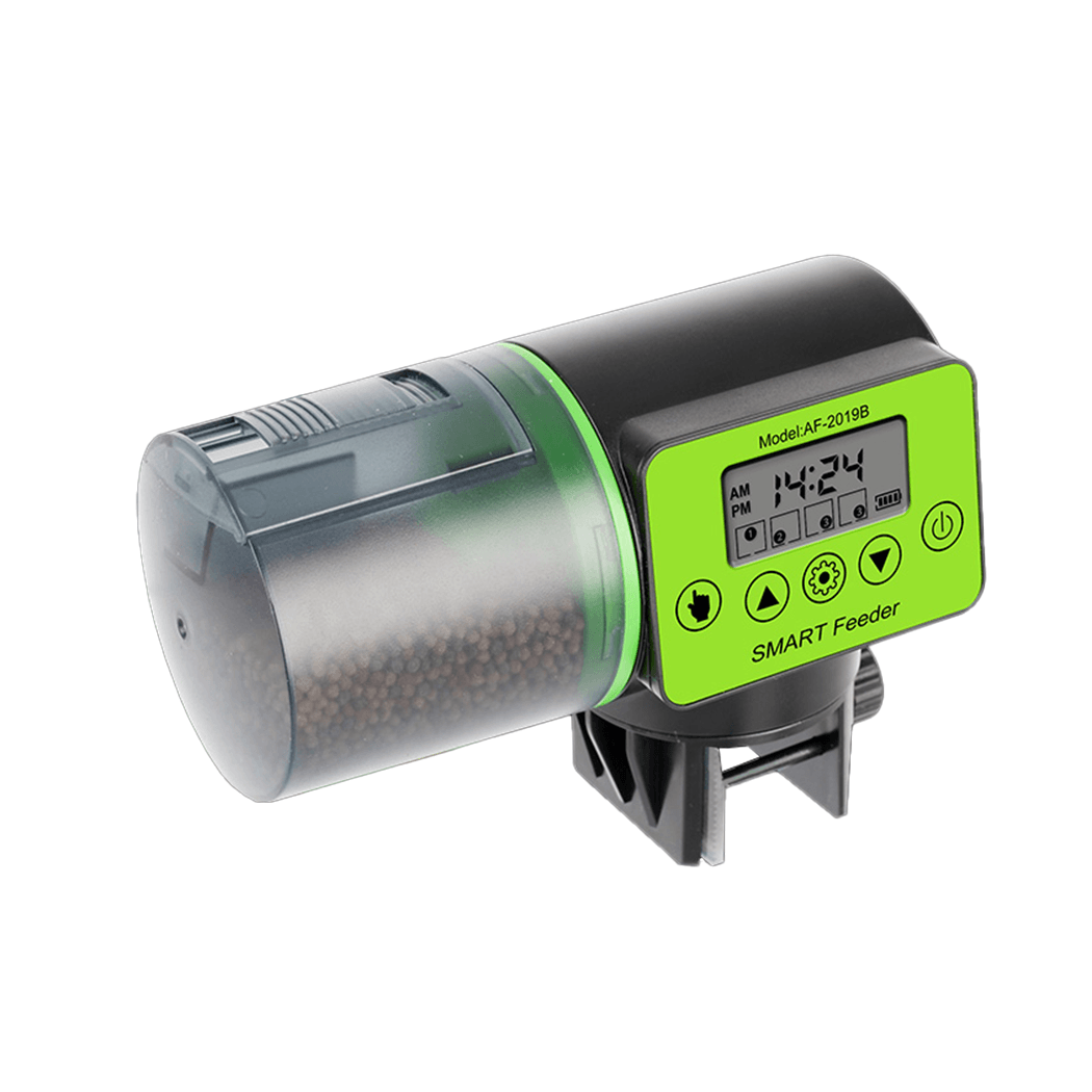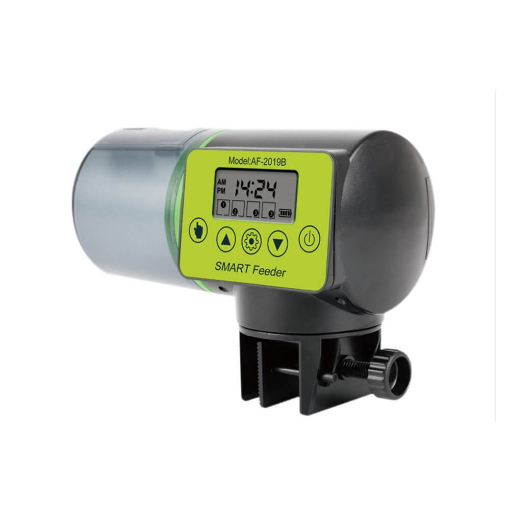 Компактная автокормушка SMART Feeder AF-2019B позаботится о том, чтобы рыбки и другие обитатели аквариума были сыты и здоровы. Устройство можно настроить таким образом, чтобы оно в определенное время высыпало установленное количество корма. Можно запрограммировать до четырех кормлений в день. Информация о настройках выводится на экран. Компактный прибор занимает минимум места. Он устанавливается на стенку аквариума и поворачивается перед тем, как высыпать корм. Для работы необходимо высыпать корм в емкость и позаботиться о достаточном уровне заряда батарей – 2 пальчиковых аккумулятора необходимо приобретать отдельно. Автокормушка – находка для тех, кто любит рыб, но из-за своей занятости не может педантично выполнять рекомендации по уходу за ними.